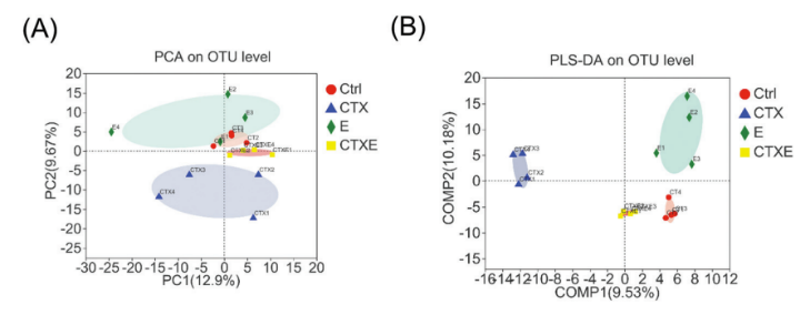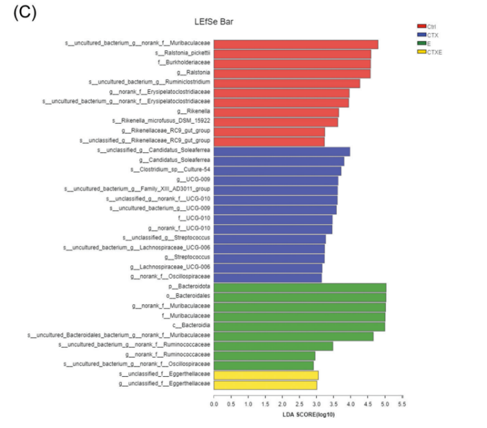 研究發現經CTX給藥后,小鼠體重下降,腸道受損。口服EGCG則可通過多種機制有效緩解這一癥狀,減輕“腸漏”癥狀。EGCG有效抑制CTX引發的炎癥應激及氧化應激反應,對CTX引發的腸道菌群紊亂也具有一定的調控作用。在對結果進行LEfSe分析后發現,CTX處理小鼠在服用EGCG后,Eggerthellaceae成為其標志性菌群(LDA>2)。