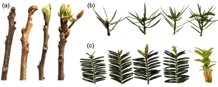 樹木在冬季來臨之前會提早做好越冬準備,進入生理休眠狀態(endodormancy)。在此階段,樹木生長受內部生理因素限制,即使處于適宜生長的環境,也不會萌芽。而后,樹木必須經歷冬季低溫累積,才能逐漸打破生理休眠,進入生態休眠狀態(encodormancy),此時樹木只要經歷一定高溫累積,就能啟動萌芽。因此,生理休眠和生態休眠是物候建模的兩個基本過程。長期以來,大部分過程物候模型都是基于北方溫帶樹種的物候特征,而忽略了不同地域樹種的生理差異,導致模型預測真實性難以判斷。