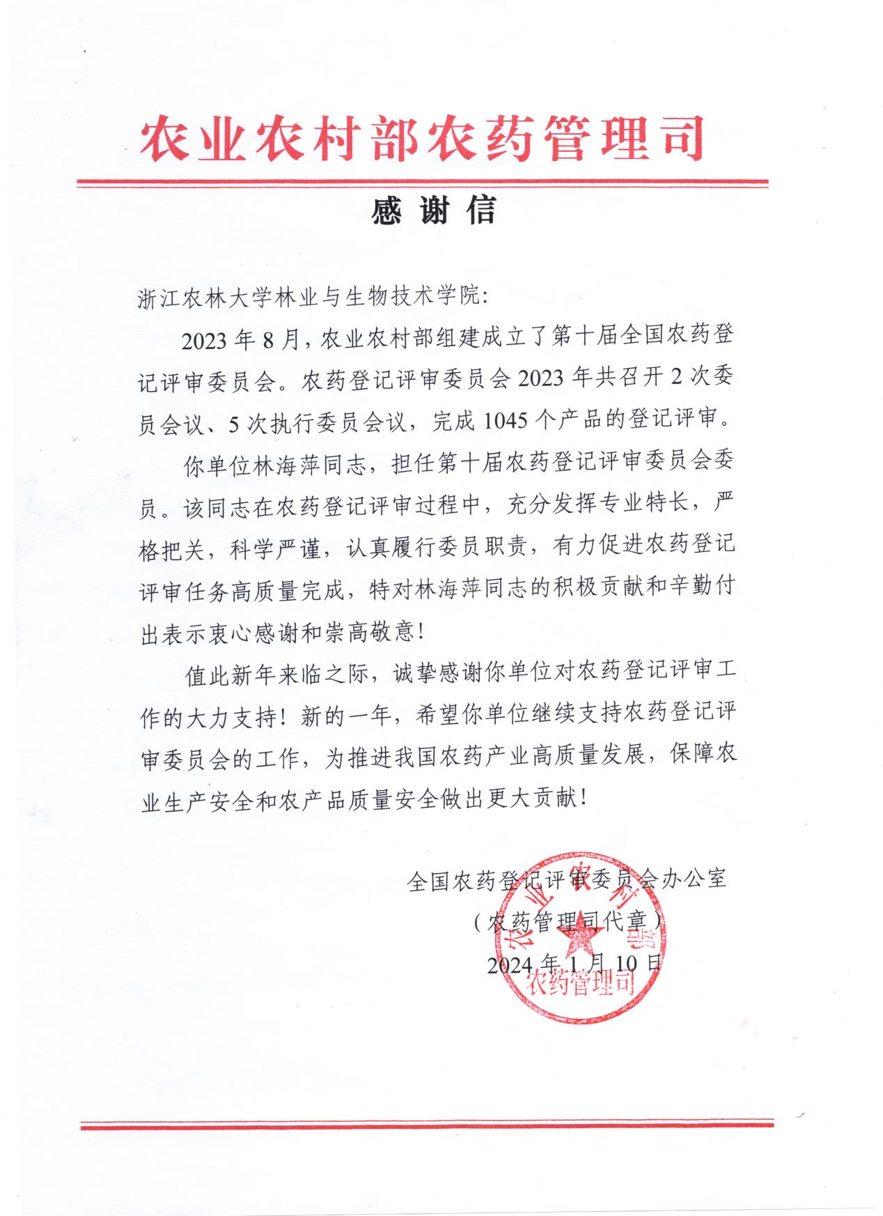 農業農村部農藥管理司向林生院發來感謝信