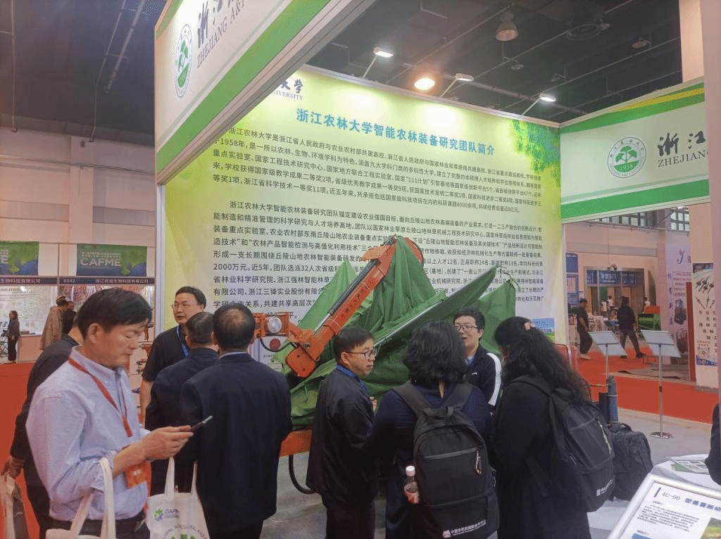 4月26-28日,第二屆中國丘陵山區農業機械博覽會暨中國(永康)農林裝備博覽會以“數智農機 創新引領”為主題,以展示推廣丘陵山區先進農林裝備為核心在浙江永康舉辦。我校智能農林裝備研究團隊精心挑選了4LMD-22 電動梳刷式藍莓采摘收獲機、折展式林果振動采收一體機、遙控履帶式果園割草機、2BM-3型林木無紡布大小容器苗間自動移栽機、古樹名木無損檢測探傷儀等五臺(套)裝備精彩亮相博覽會,整個三天的參展期間團隊教師及研究生熱情周到細致的推介學校農林裝備科研成果、積極深入地與參會觀眾互動,充分展示了我校致力鄉村振興、培養知農愛農人才的良好形象。