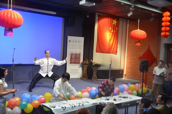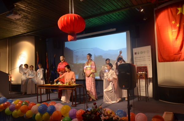 塞爾維亞綜合排名第一的Jovan Jovanovic Zmaj高中漢語教學點派出了其學生專業合唱團,為慶典奉上了一曲優美的“茉莉花”,讓人陶醉。“漢語國際推廣茶文化傳播基地”茶文化培訓負責人與孔院學生合作,以獨特的方式呈現了茶與禮儀、茶與服飾等傳統文化,將古典含蓄以新的視角華麗綻放。中國書畫家夏偉革和汪曉亮應現場展示了中國書法和水墨藝術。中國書畫展示與諾維薩德老虎武術俱樂部帶來的太極文化相互相成,相得益彰。兩者的融合成為本次慶典活動的亮點,深受大家的喜愛。