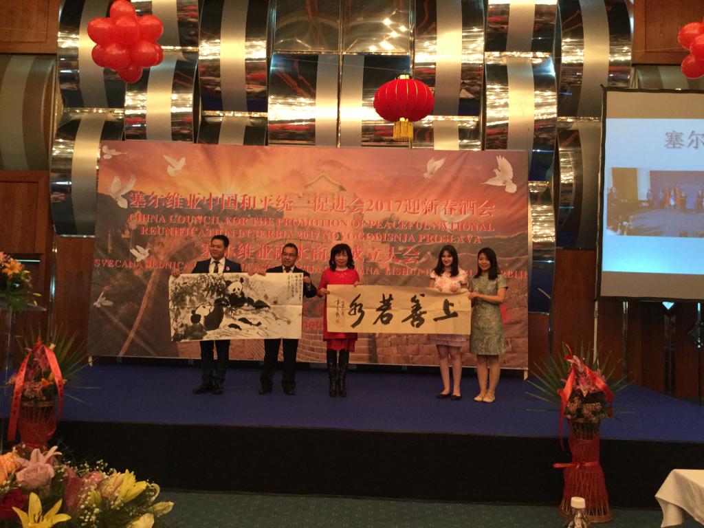 當(dāng)?shù)貢r(shí)間2017年1月10日,塞爾維亞中國(guó)和平統(tǒng)一促進(jìn)會(huì)迎新春酒會(huì)暨塞爾維亞麗水商會(huì)成立大會(huì)在貝爾格萊德舉辦。塞爾維亞總統(tǒng)顧問(wèn)Jovan Roganovic、 國(guó)家資產(chǎn)管理局局長(zhǎng)Jovan Vorkapic、中國(guó)駐塞爾維亞大使館代辦盧山等中塞嘉賓共三百多人參加了該活動(dòng)。期間,諾維薩德大學(xué)孔子學(xué)院成功助力推廣多彩的中國(guó)文化,深受大家的贊譽(yù)。