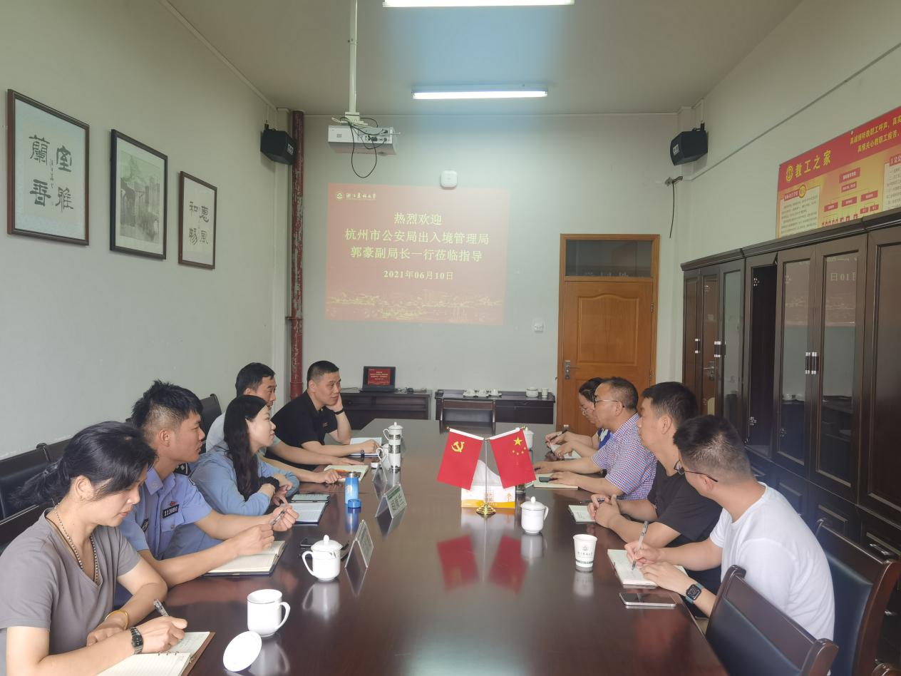 近日,杭州市公安局出入境管理局副局長郭豪一行來我校就來華留學(xué)生簽證、推行杭州市市民卡國際版和校內(nèi)管理等相關(guān)事宜進(jìn)行調(diào)研和指導(dǎo)。