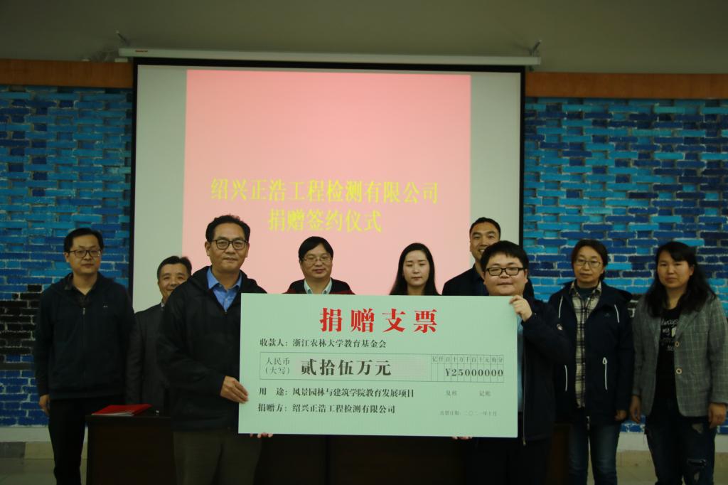 10月28日,園林學院與正浩工程檢測有限公司捐贈簽約儀式在浙江農林大學東湖校區舉行。浙江農林大學校友辦主任楊黎明,正浩工程檢測有限公司總經理苗鴻浩及公司代表,園林學院黨委書記王欣等出席簽約儀式。